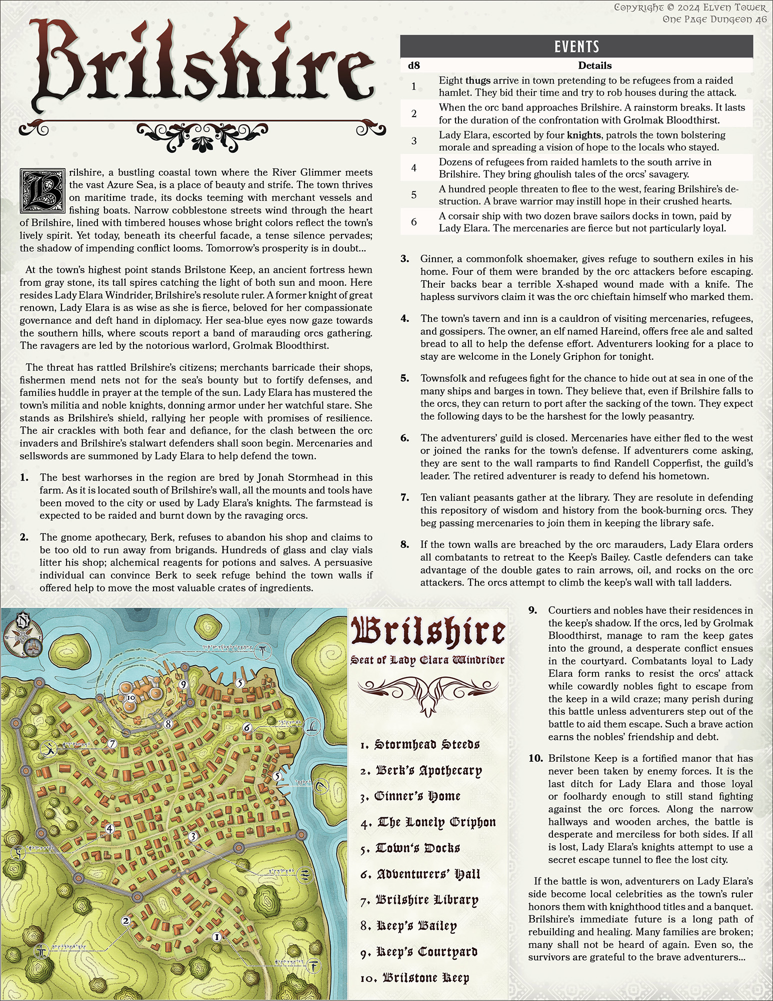 In Brilshire, the are in the thriving, coastal city of Brilshire. Normally a peaceful and busy place but today most people’s faces are somber and anxious. A threat looms on the horizon as orc ravagers approach the city walls. Tonight, the orcs shall attack the city and storm its walls. The town’s ruler, Lady Elara, stands as the shield of the people. She rallies fighting men to the wall ramparts and the barracks.