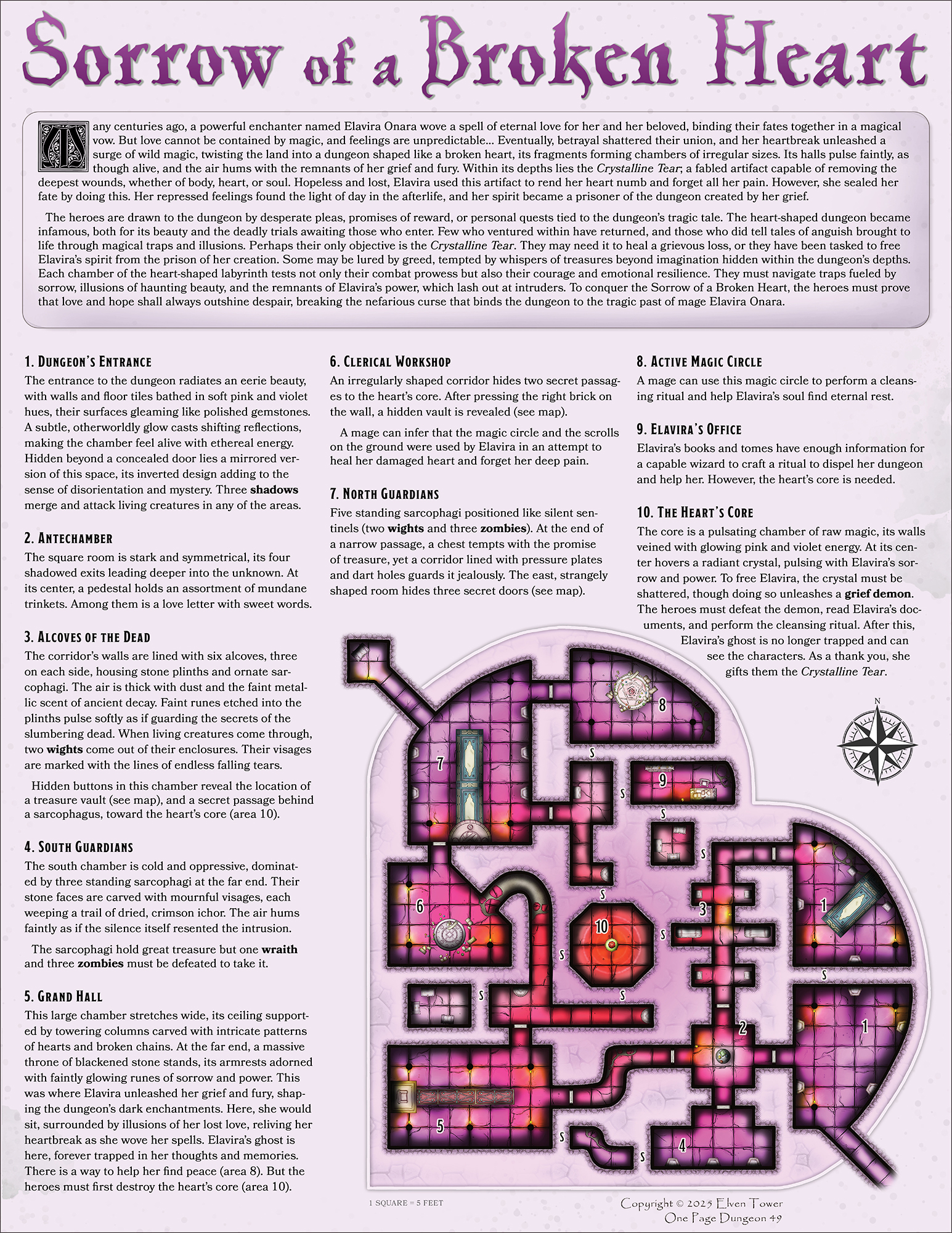 This is our 49th installment of the one-page dungeon series. The objective is to create self-contained adventures/dungeons with all things necessary to spawn fun adventures on a single page. It is system-neutral so it can be easily ported to any system. It shouldn’t be much trouble to include it in any medieval setting. This one is about a love-stricken enchantress who created a magical item with her bare feelings, the Crystalline Tear.