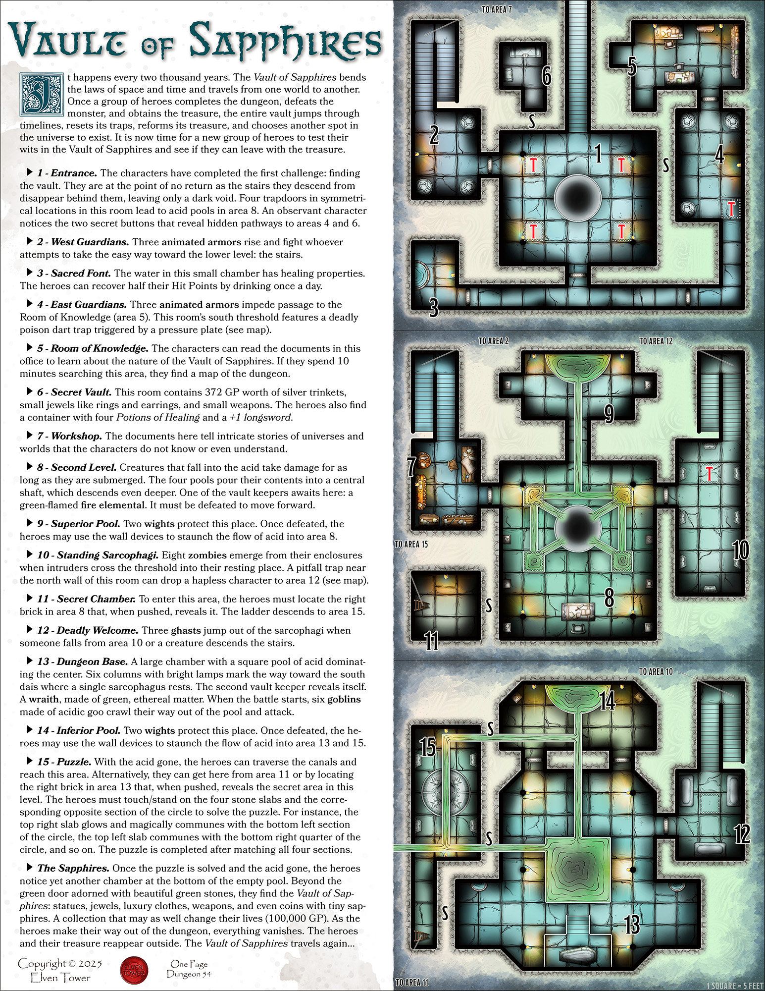 This is our 54th installment of the one-page dungeon series. The objective is to create self-contained adventures/dungeons with all things necessary to spawn fun adventures on a single page. It is system-neutral so it can be easily ported to any system. It shouldn’t be much trouble to include it in any medieval setting. This one is about a marvelous, extraplanar dungeon filled with treasure. After visitors leave, the Vault of Sapphire resets itself and teleports to a new location in the multiverse.